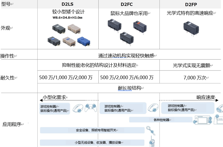 “D2FC”“D2LS”“D2FP”3個系列操作專用微動開關